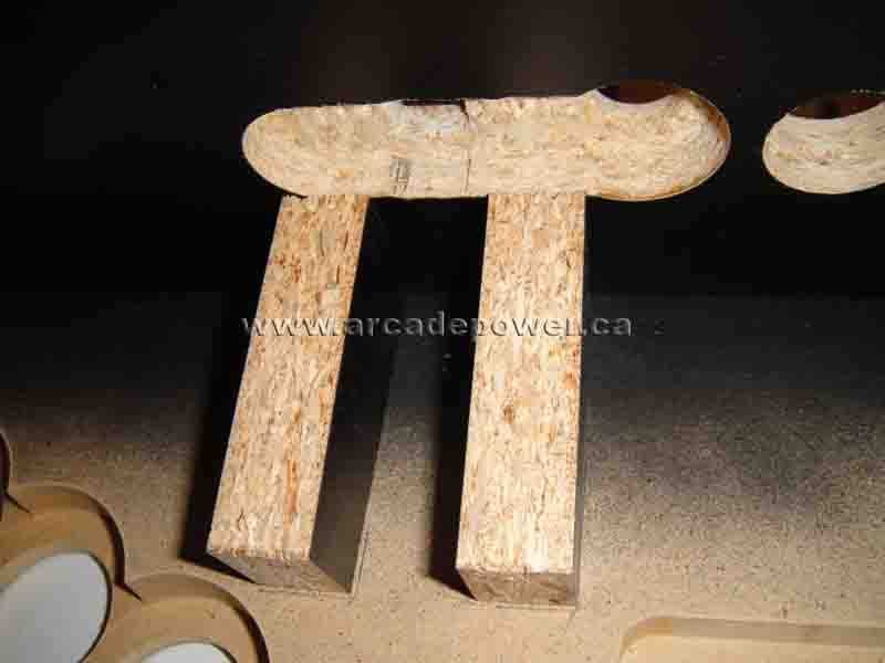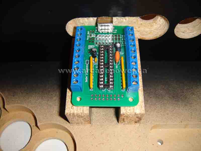 Cut two pieces of wood and glue it on the base of the front panel. This will serve as the base of where the Cthulhu board will be mounted. Attach the board onto the wood pieces with two screws.